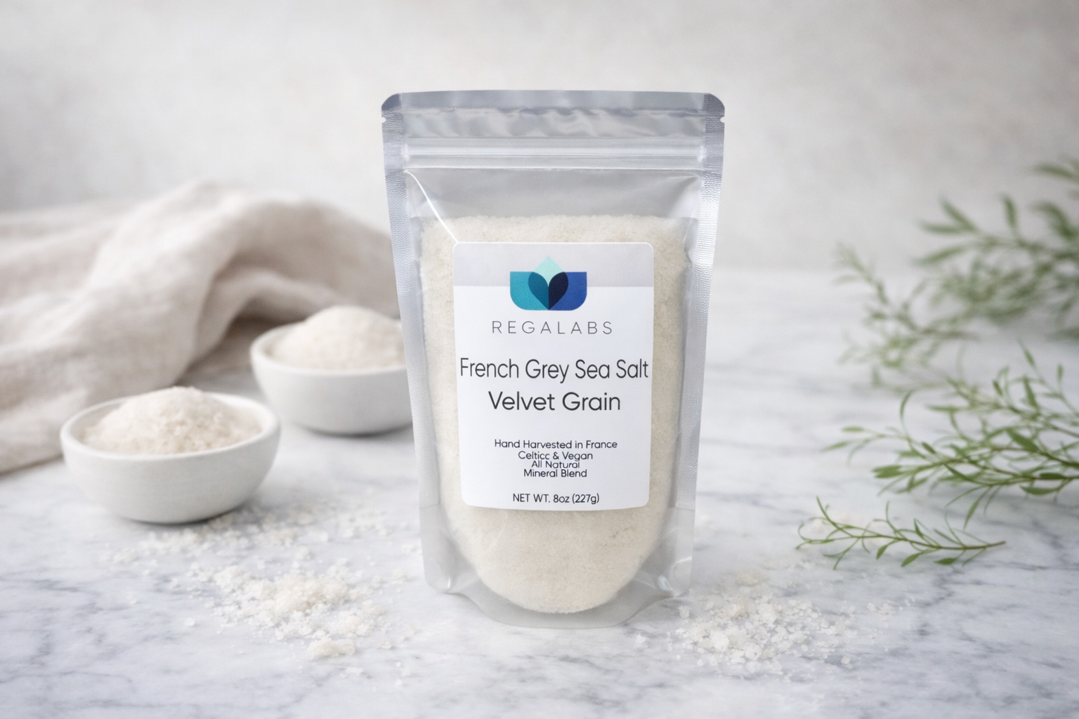 Regalabs all-natural, unrefined French Celtic Sea salt elegantly captures the strong, briny flavor of the sea. With its natural trace minerals and moisture, Regalabs Velvet Sea Salt is the ideal staple for all of your salt needs!